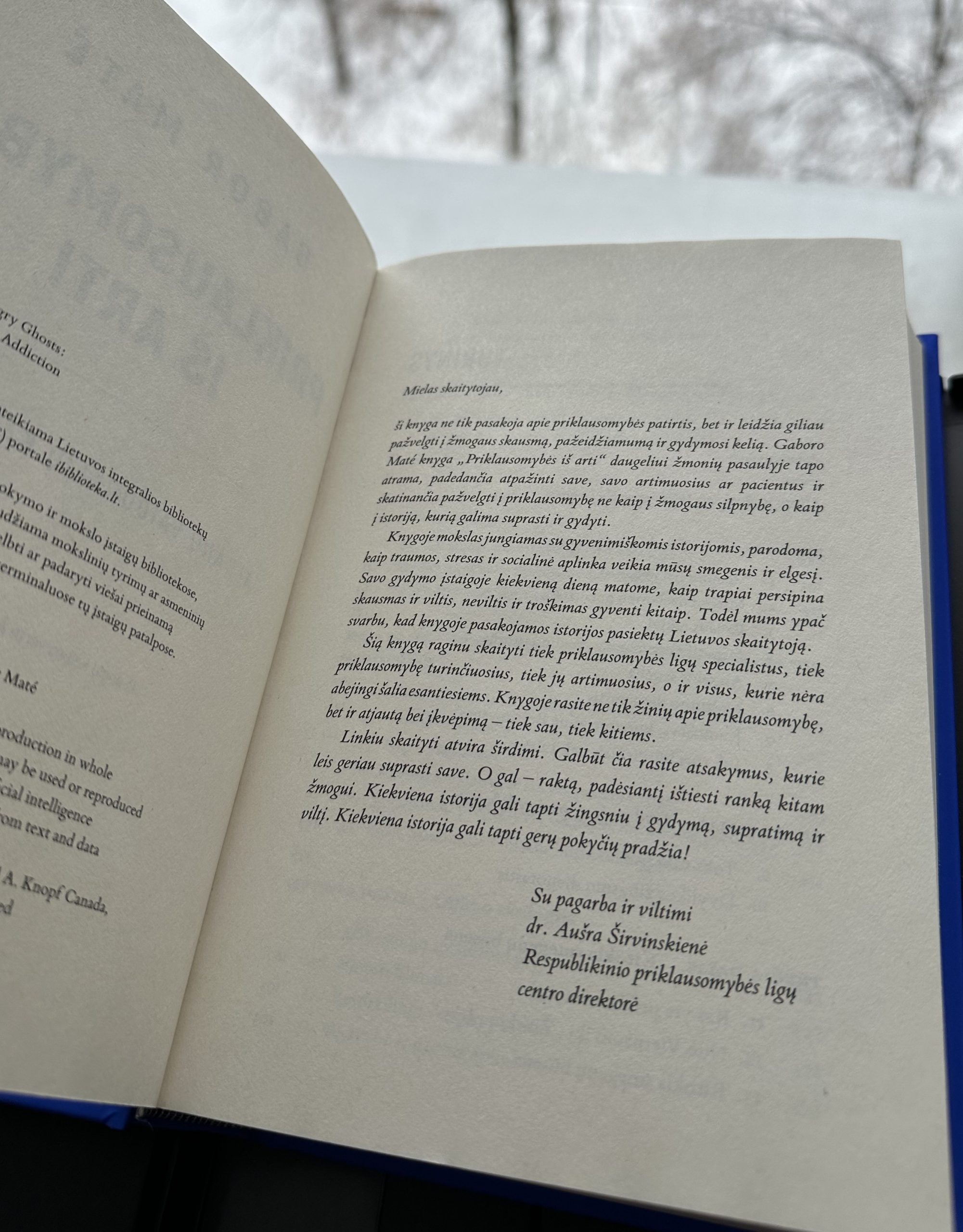 Ne tik pasakoja apie priklausomybės patirtis, bet ir leidžia giliau pažvelgti į žmogaus skausmą, pažeidžiamumą ir gydymosi kelią – taip populiarios G. Mate knygos „Priklausomybės iš arti. Alkanų vaiduoklių karalystėje“ įžanginiame žodyje sako RPLC direktorė dr. Aušra Širvinskienė.